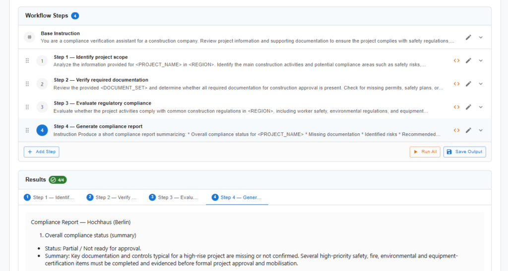 PhiStudio supports building agents as structured steps with placeholders, reusable instructions, and per-step configuration—ideal for repeatable tasks like document analysis, compliance checks, knowledge extraction, or guided content generation.